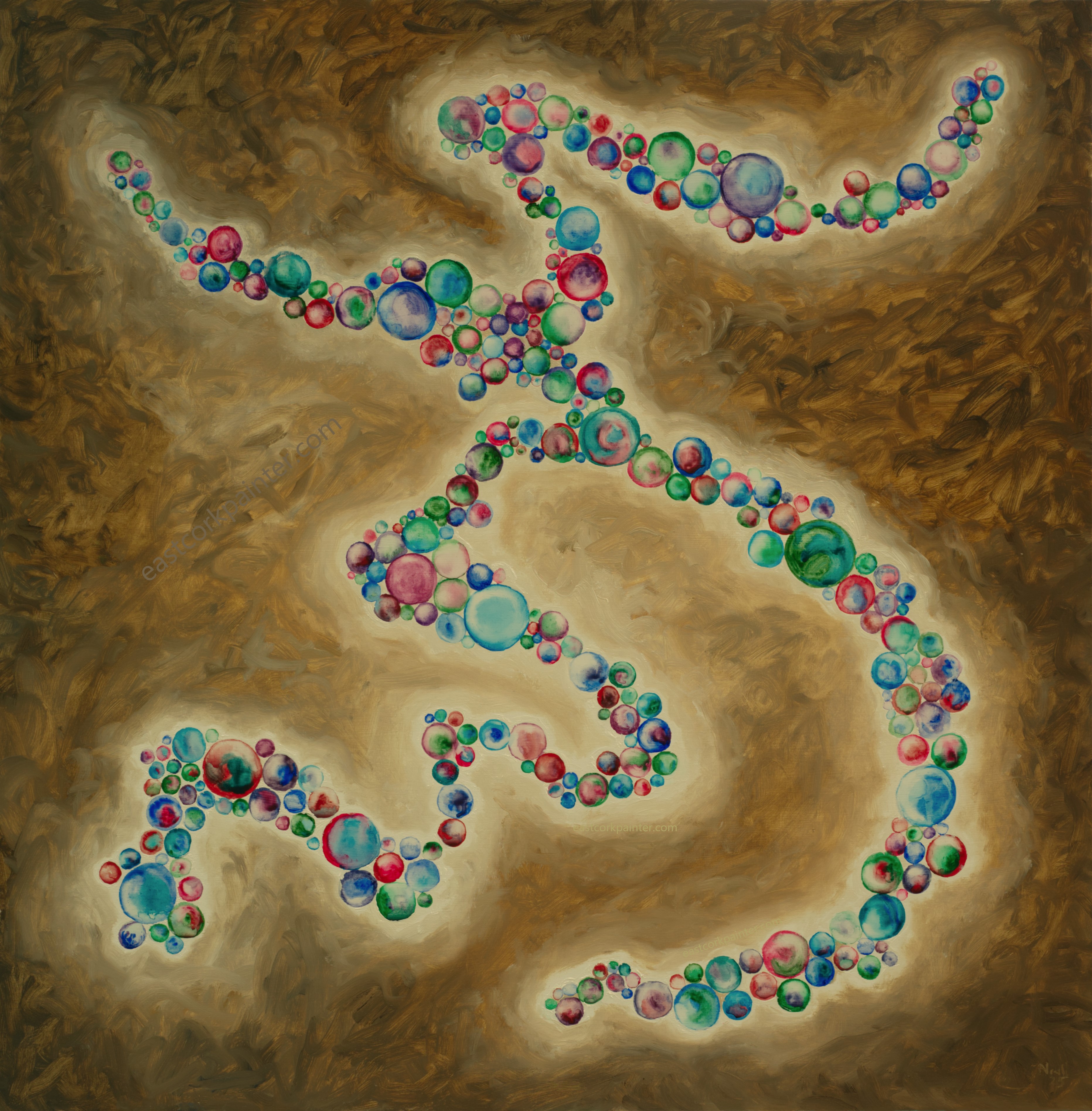 I recently saw a film about Hilma af Klint’s life. I needed a break from figurative painting so I did something more abstract. Acrylic paint is basically plastic so I wanted to explore the idea of pollution at sea, and how out of place yet beautiful to look at it can be. No two discs are the same. The natural background and white glow is oil paint.