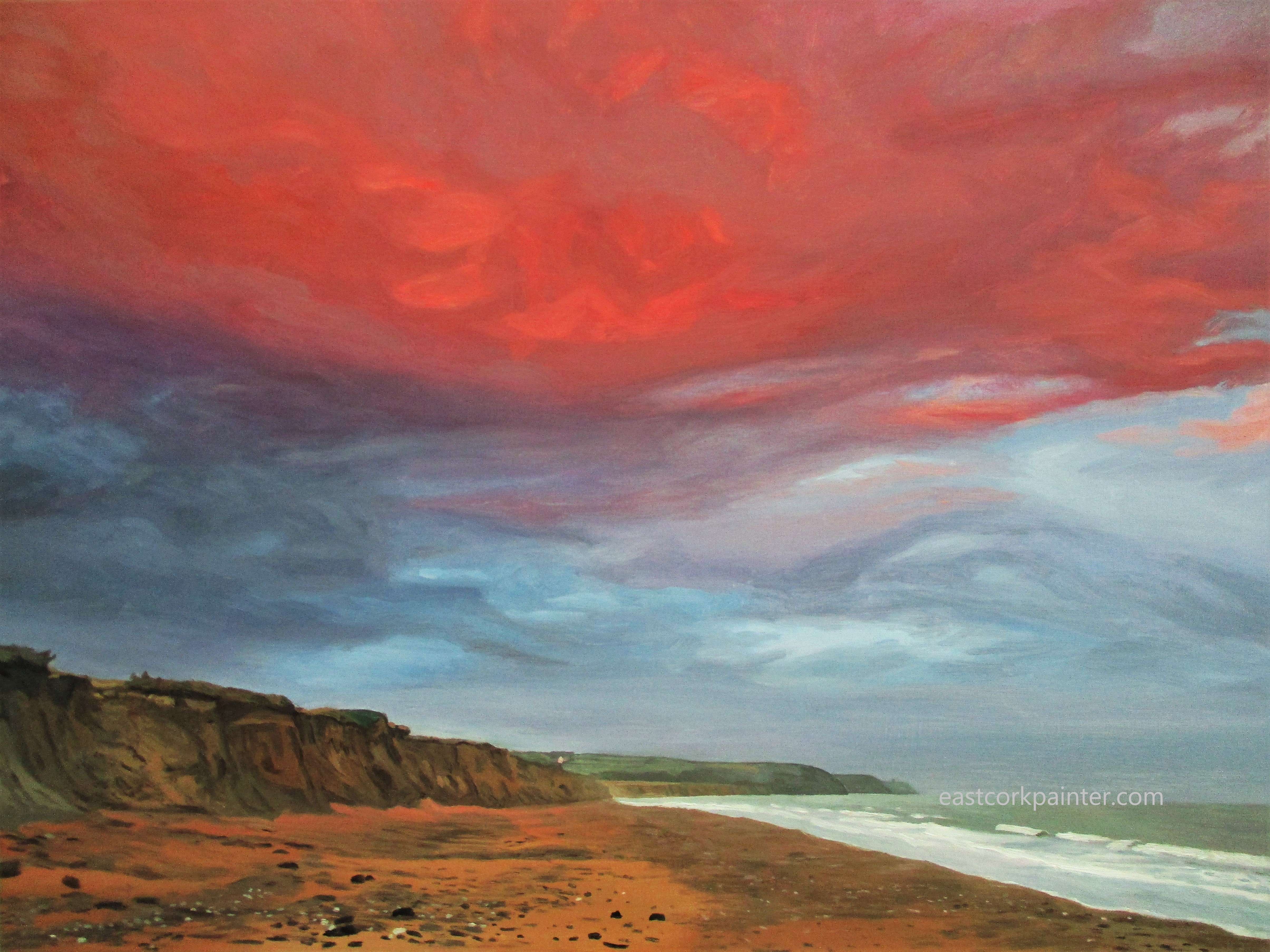 Red Sky Over Red Sand – Sold May 6, 2017 by eastcorkpainter in art and tagged art, atmosphere, atmospheric, beach, clay, cliffs, cloud, clouds, colored, coloured, depth, detailed, east cork, garryvoe, intense, ireland, irish, knockadoon, landscape, niall mccarthy, oil, painting, peninsula, realism, realistic, red, rusty, sand, sky, spacious, sublime, swirling, traditional, vapour, view, vista | Leave a comment
