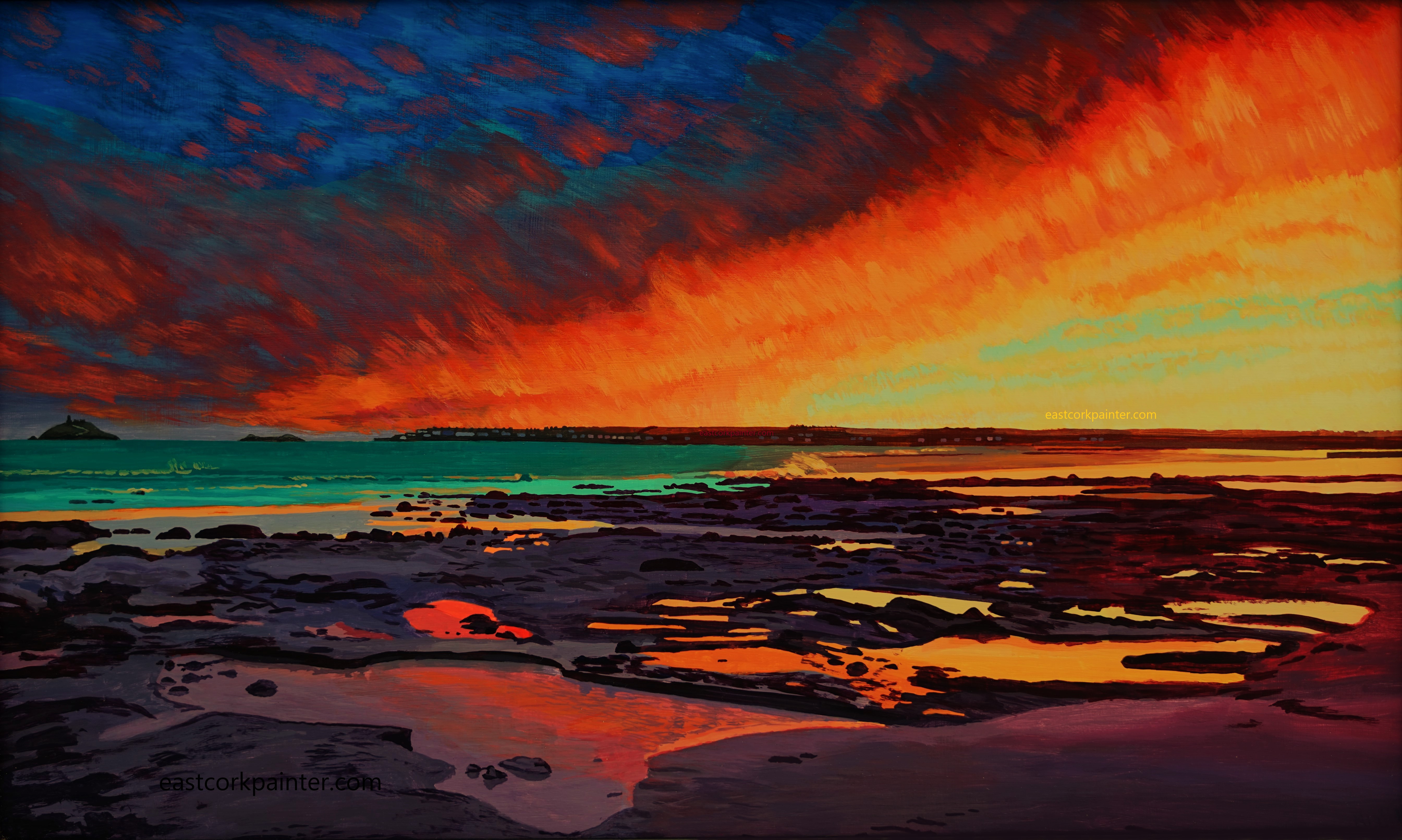Fiery Sunset Over Garryvoe Beach – Sold December 21, 2016 by eastcorkpainter in art and tagged acrylic, acrylics, art, ballycotton, bay, beach, bright, clouds, cloudy, colors, colours, daylight, east cork, expressive, fiery, garryvoe, intense, ireland, irish, landscape, light, neon, niall mccarthy, orange, painting, pools, psychedelic, realism, rockpools, rocks, sea, seascape, shore, strand, sunset, vivid, water, winter | 1 Comment