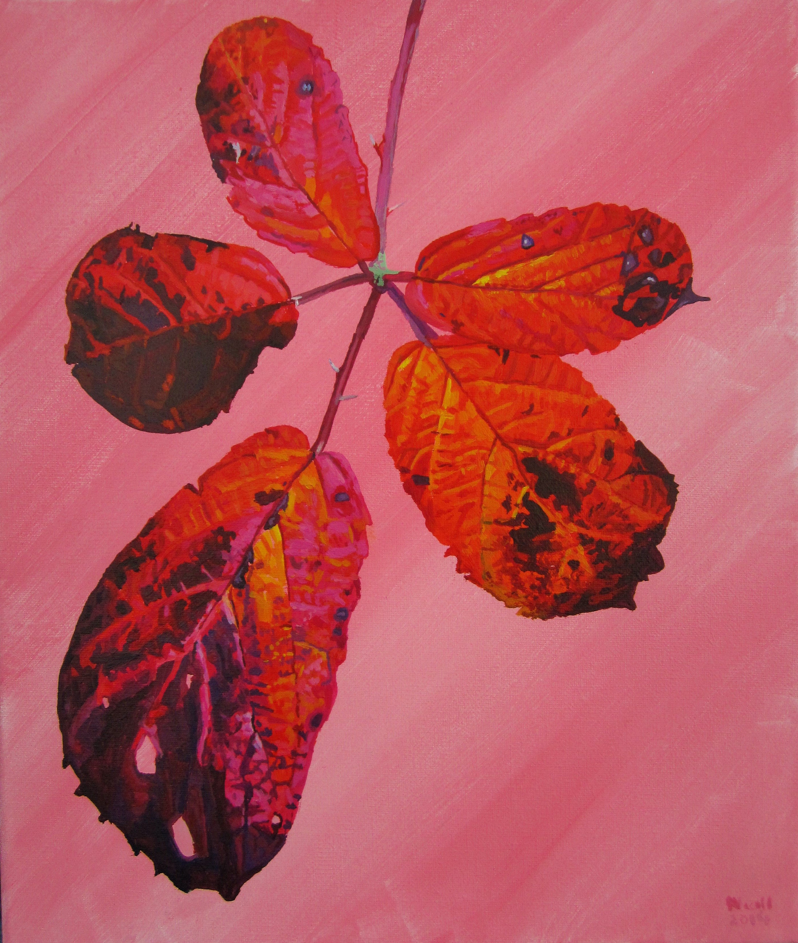 This is the third painting I’ve done on this subject. The background is actually dark green rather than black. These briar leaves were the first ones I found when I was walking in Rostellan Wood, which is the same place that I sourced the briar leaves used in the first two paintings.