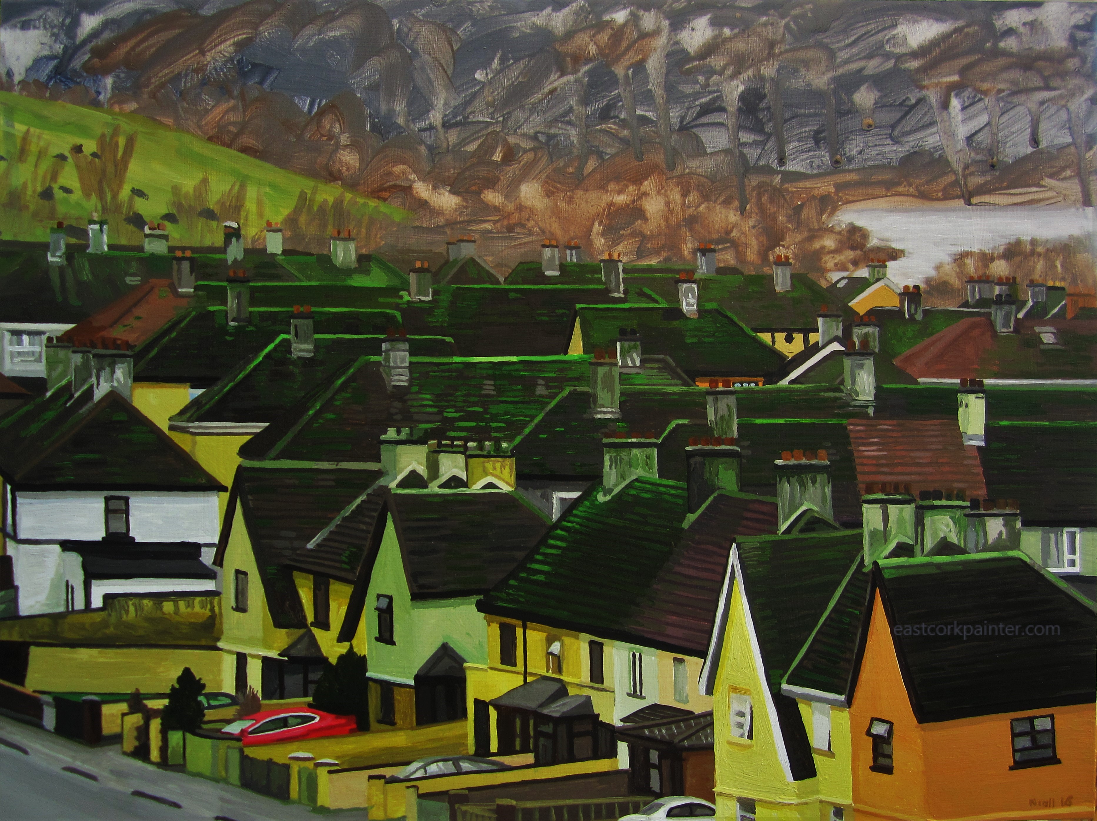 This place is about two miles from home. When I was small I’d pass it everyday heading to and from primary school. Some of my father’s mother’s ancestors are buried here. The church is an old 17th century Protestant church. This is the third painting of a graveyard I’ve done. Snow is a rare thing where I live so it’s featured in only a handful of my paintings. I had trouble doing the tree over on the far left and the walls of the church, they slowed me down a lot. Once I was on the bottom third of the painting I raced through it. The light coloured shadows of dirty purple and light blue were satisfying to paint.