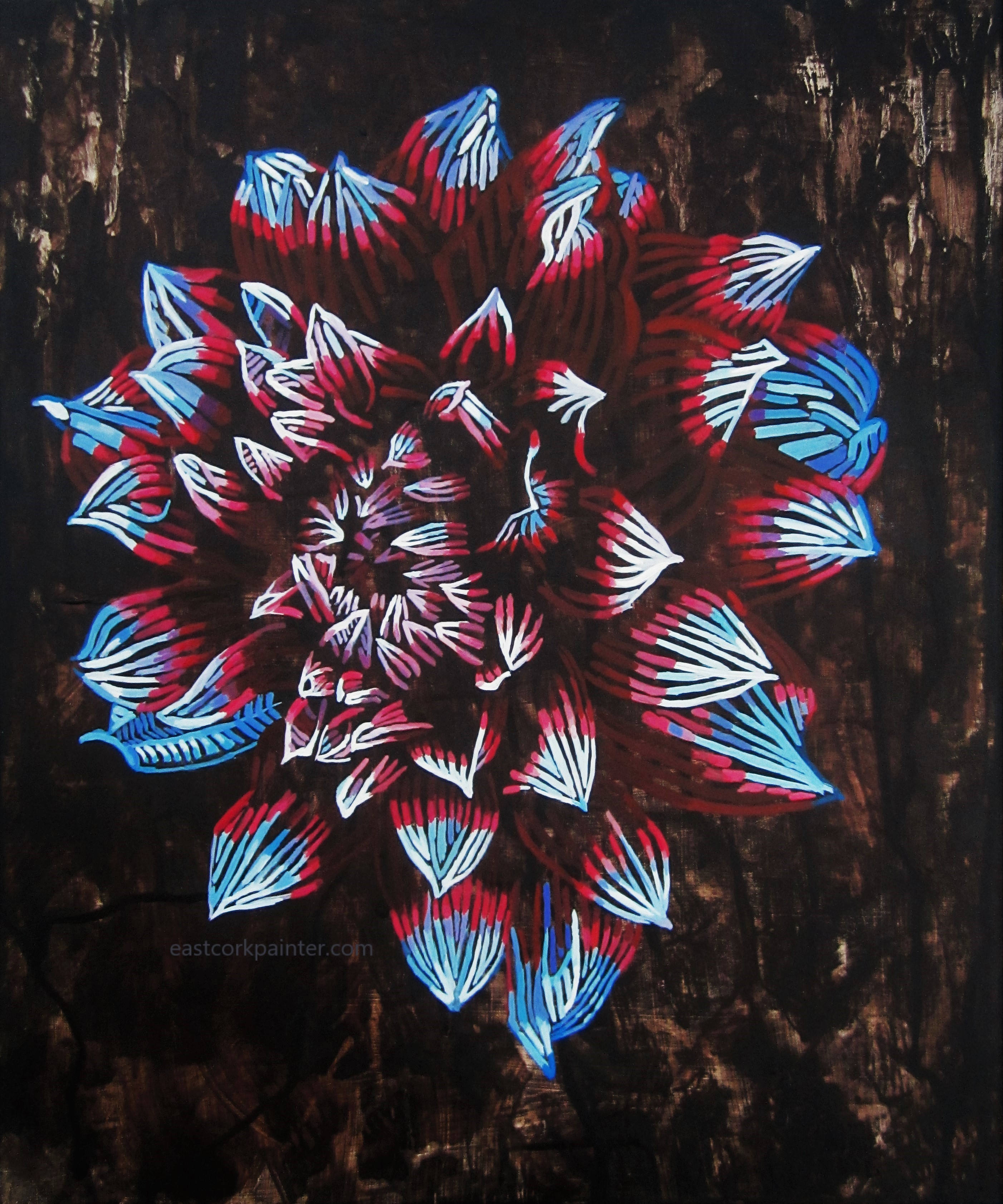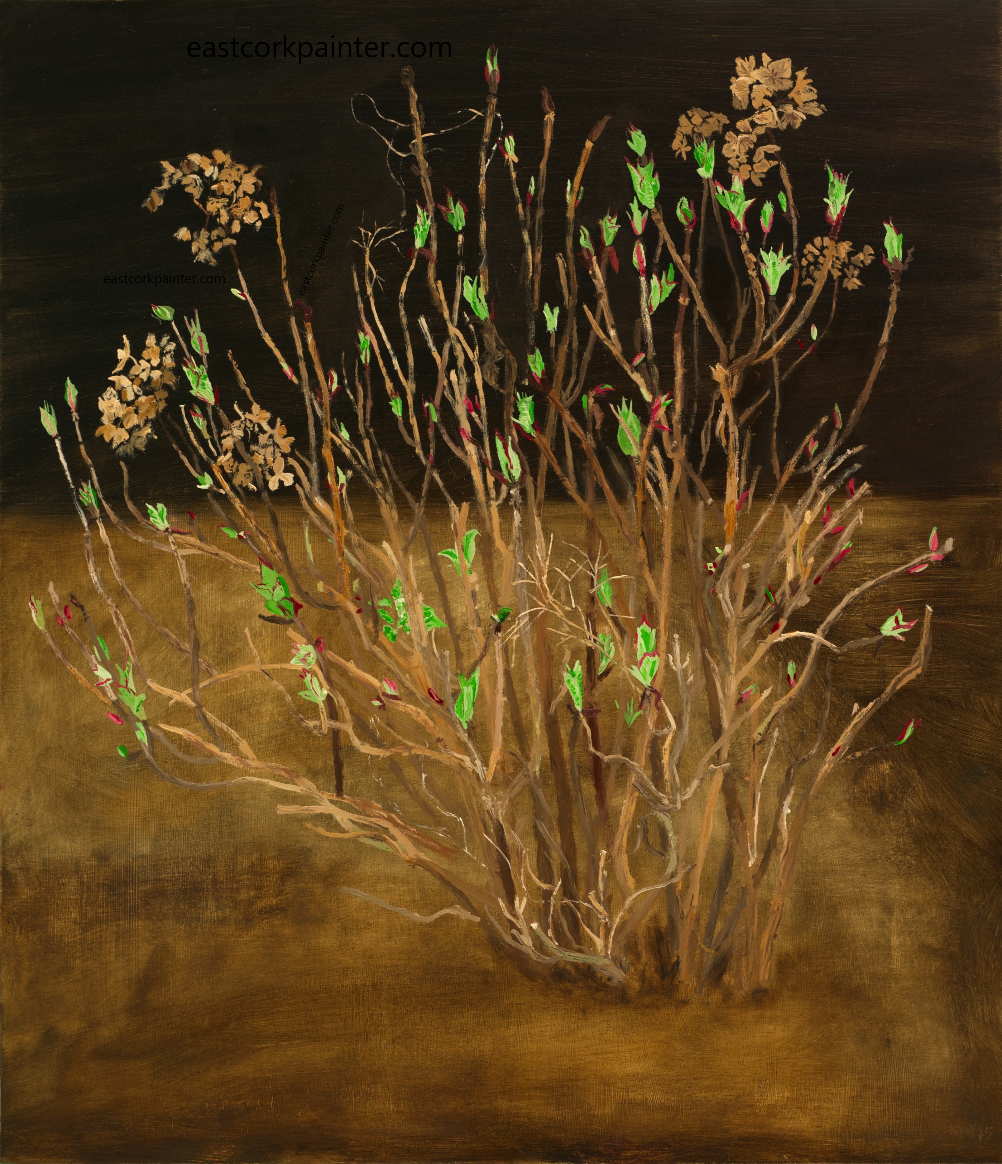 In spring and early summer, I give a hand in my sister’s flower field. Planting seed trays and pots and weeding, it can be a busy time. This painting depicts Claire in the farm shed doing flower bunches. It’s late September and near the end of the flower season. I thought the composition would be interesting, surrounded by flowers fanning out and going sideways and down rather than the usual upright direction. I’ve not done a formal painting of her before.