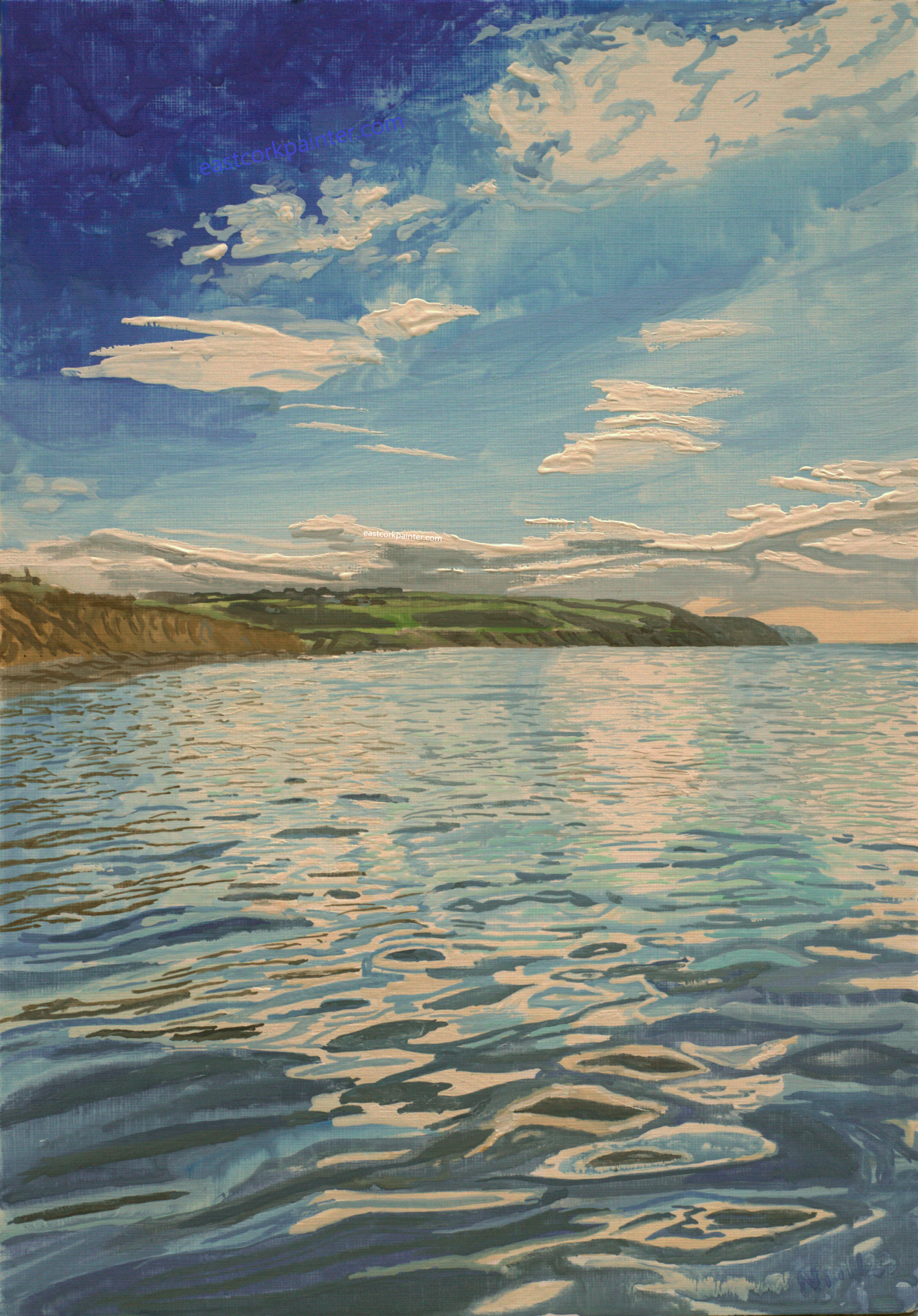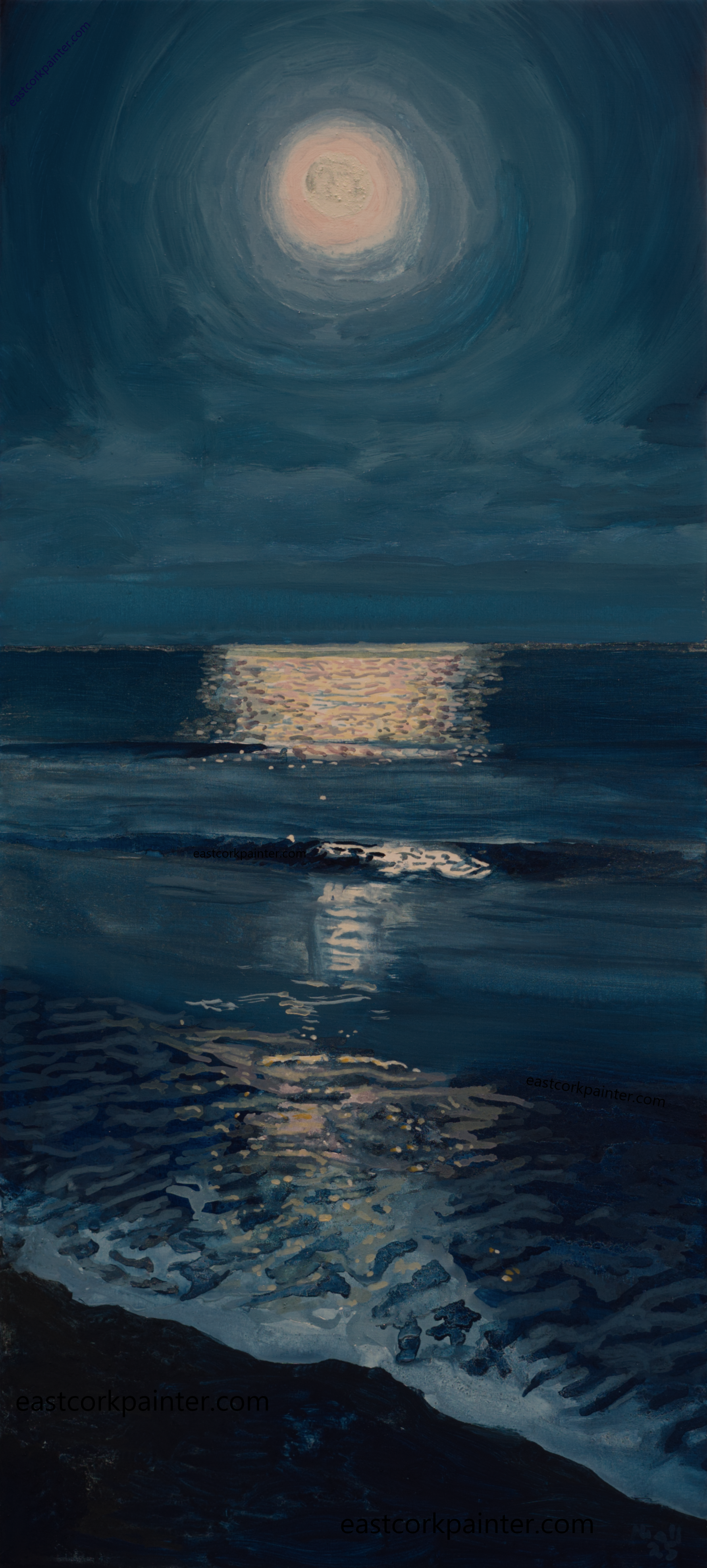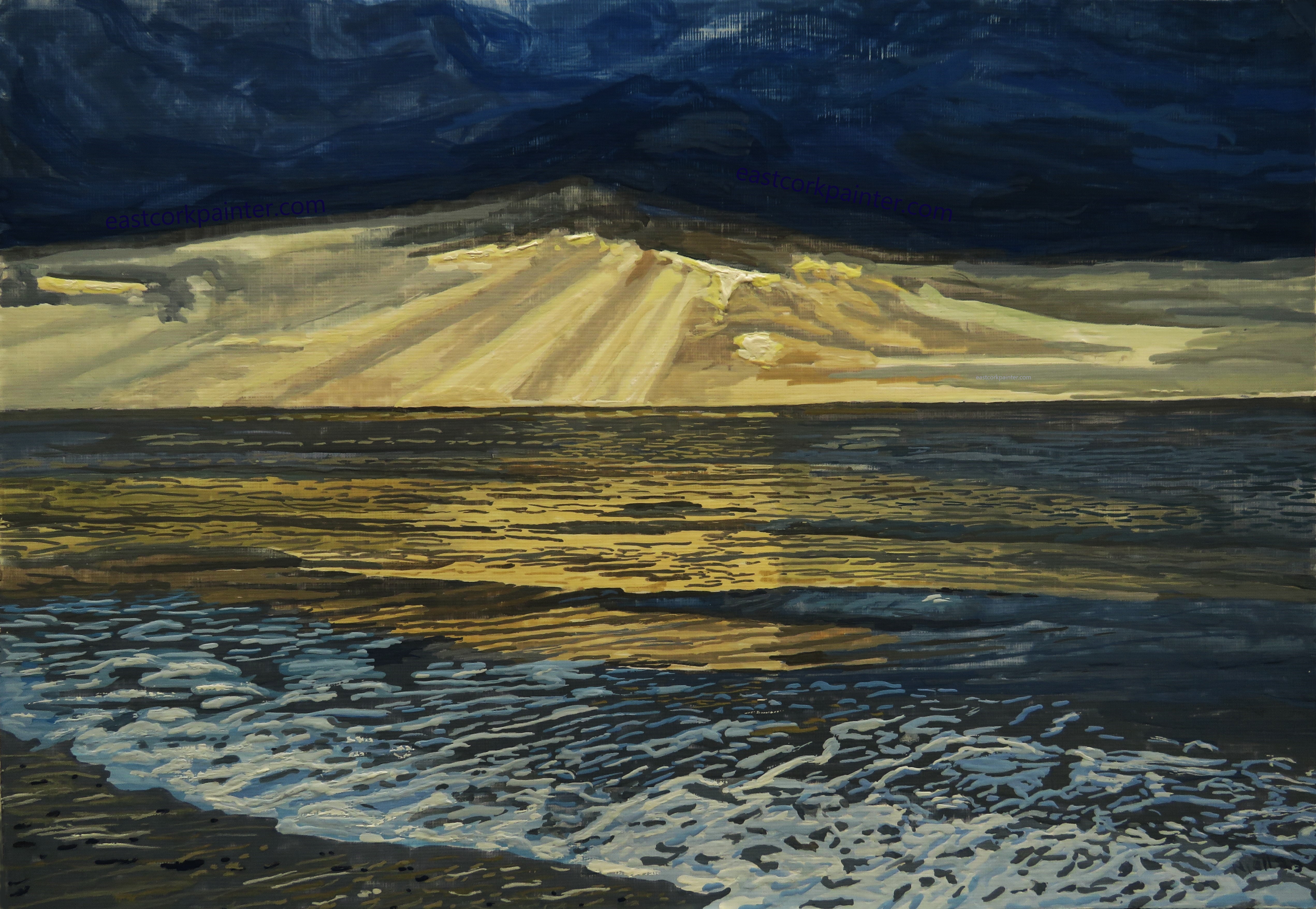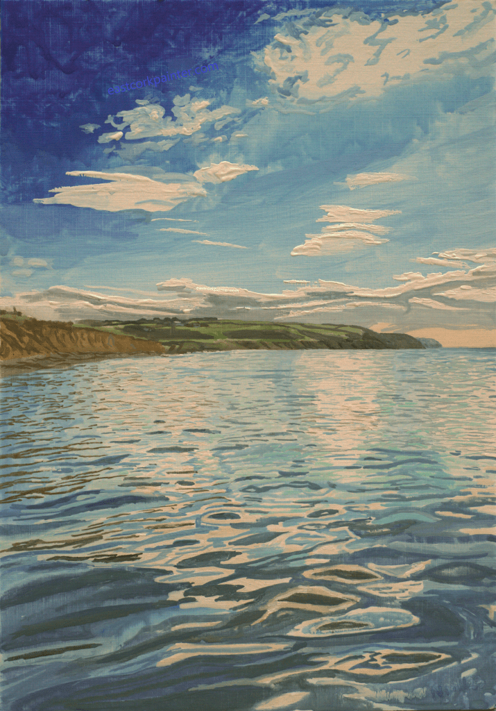 This piece was well received at my recent solo exhibition in the Grainstore Ballymaloe. It depicts a rough sea, I only got into the sea for a proper dip twice in February. The lighthouse island can barely be seen above the sea. Homemade oils used, silver for the shadows around the waves.