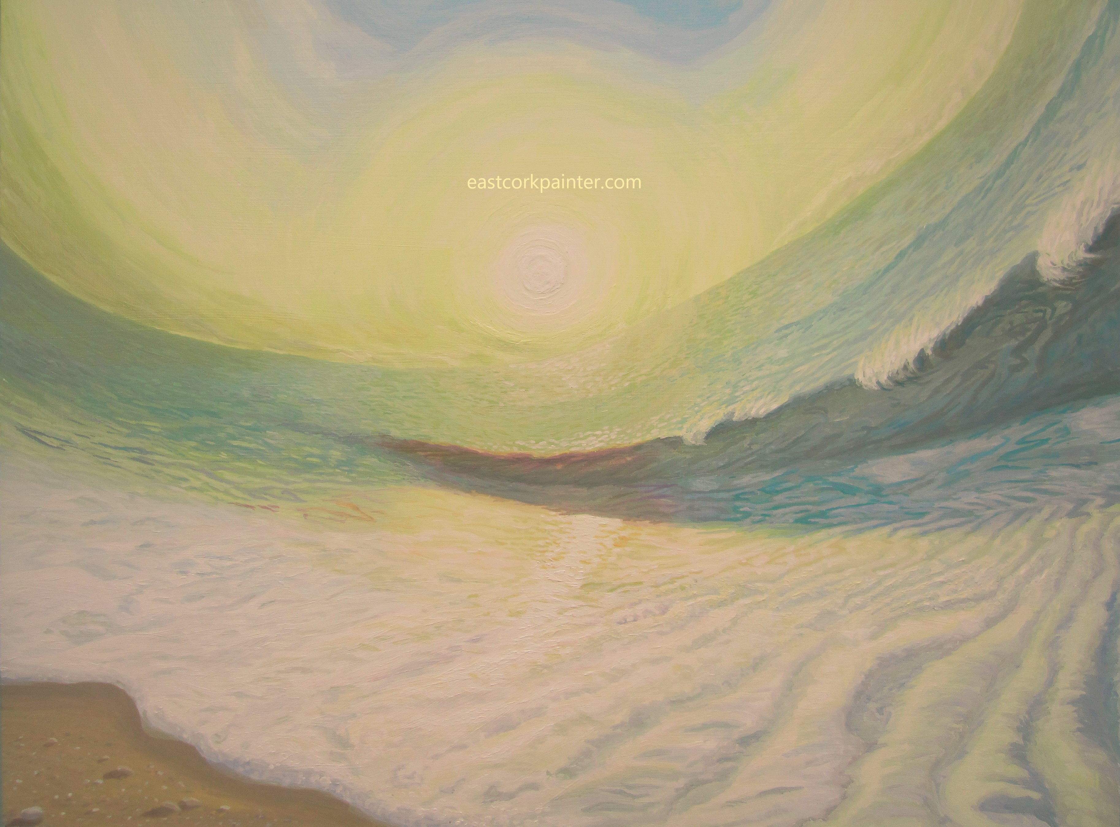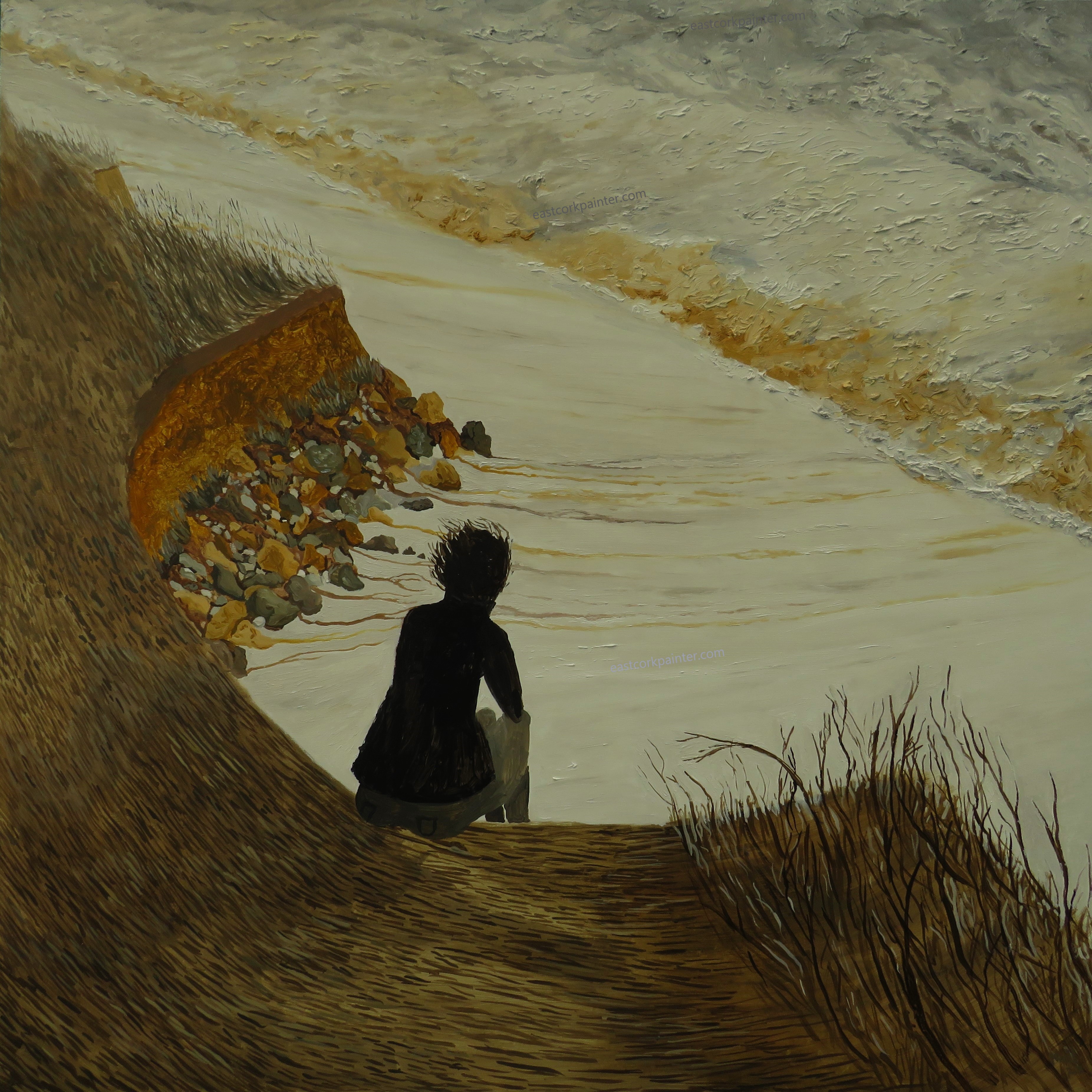 Times of the year when daylight gets rapidly longer or shorter (late March and April, October) tend to bring out vivid dreams or nightmares for me. I wake at dawn. I’m exploring that in-between moment when the dream is still fresh and you’re not sure where you are. The wood of suicides from Dante’s Inferno features in the middle in the door area and various personal memories surround it. Limited palette of ultramarine blue, raw umber and bluish silver. I painted it in casein and it gives a unique look.