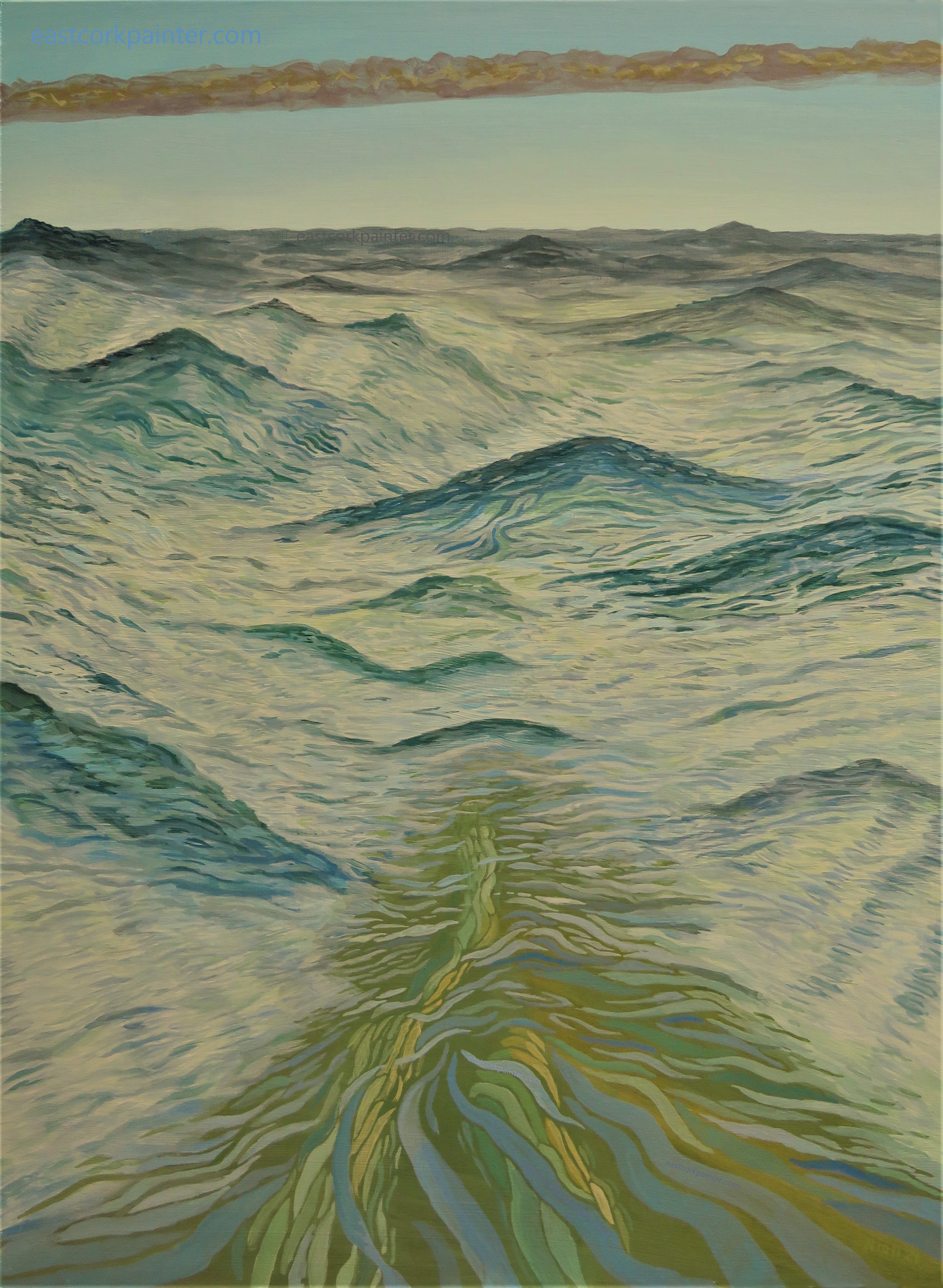 Times of the year when daylight gets rapidly longer or shorter (late March and April, October) tend to bring out vivid dreams or nightmares for me. I wake at dawn. I’m exploring that in-between moment when the dream is still fresh and you’re not sure where you are. The wood of suicides from Dante’s Inferno features in the middle in the door area and various personal memories surround it. Limited palette of ultramarine blue, raw umber and bluish silver. I painted it in casein and it gives a unique look.