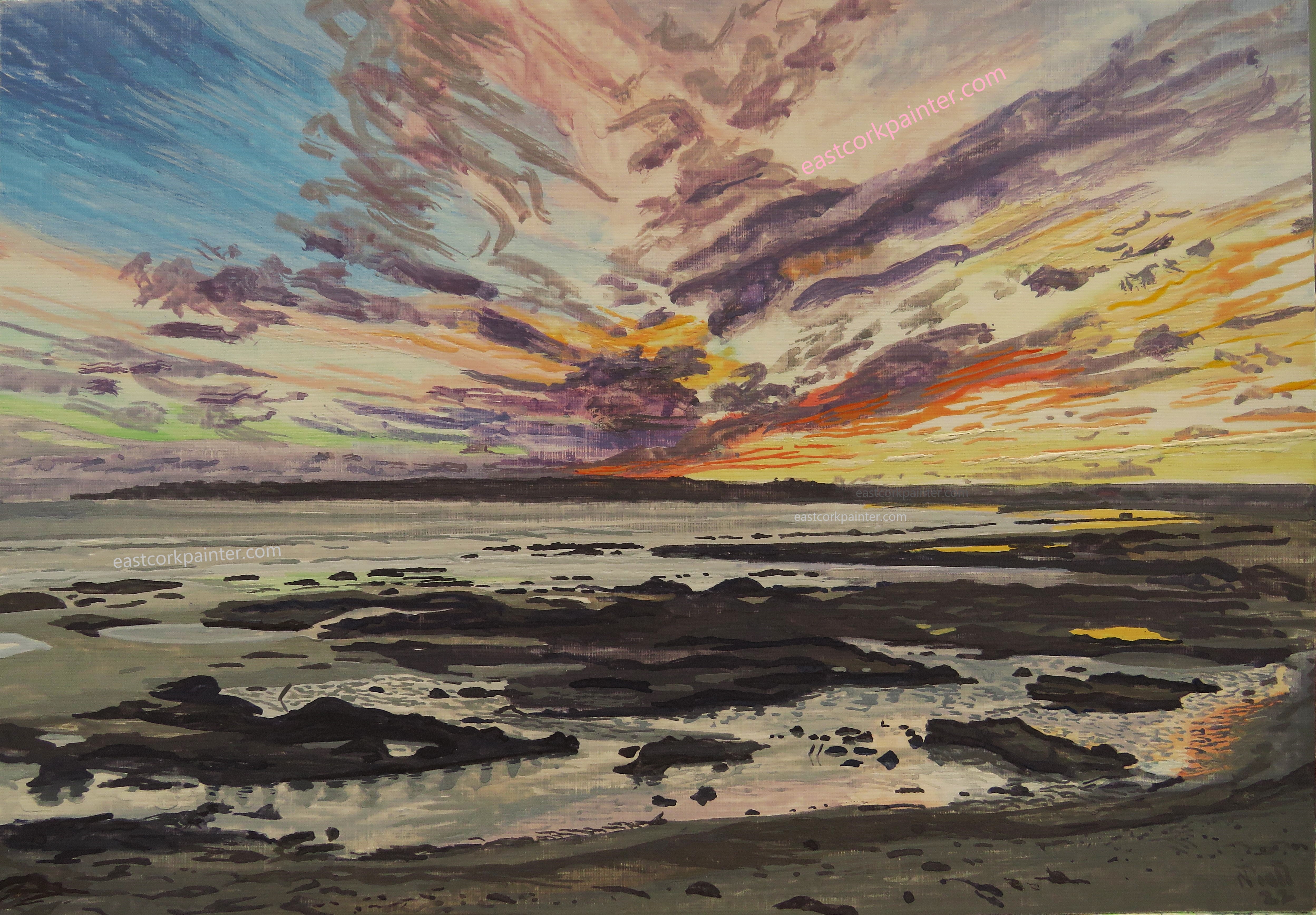 Sunset At The Rock Pools October 3, 2022 by eastcorkpainter in art and tagged art, atmospheric, beach, dramatic, east cork, garryvoe, gouache, irish, niall mccarthy, painting, pools, realism, realistic, rock, rockpools, seascape, sunset | 1 Comment