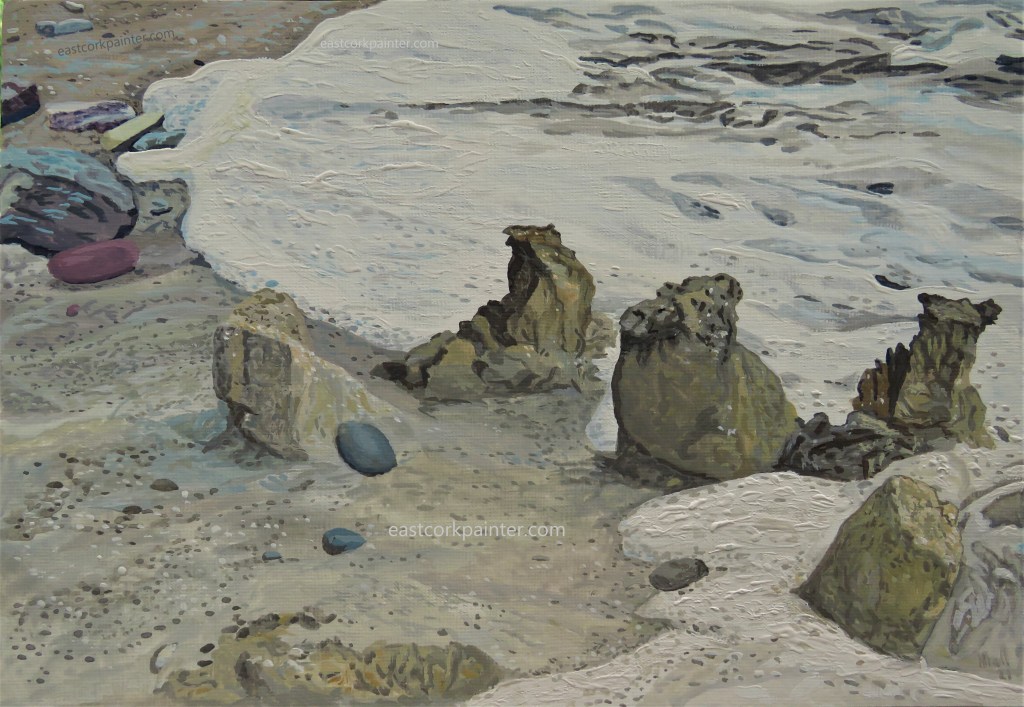 This is my first time using casein paint as a medium. Casein, the main protein found in milk, has been used as a binder for paints for millenia, long predating oil paint. Schmincke, a German paint manufacturer, make a special binding medium. I mixed my powder pigments with the binding medium to make casein paint. They are quite runny when water is added so care is needed when water is mixed. My iriodin blue silver pigment created pleasing effects on the breaking foam in the foreground.